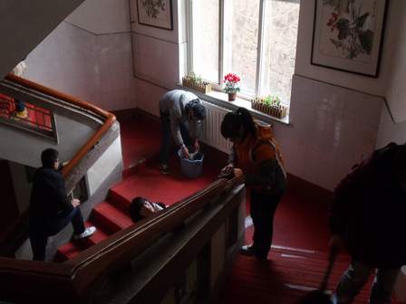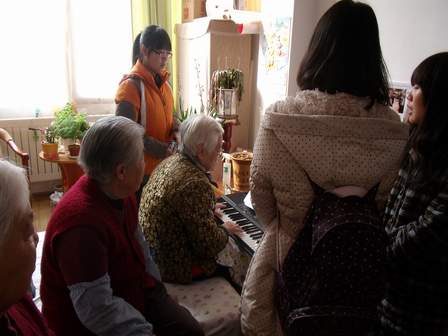 上午8点30分左右,志愿者队伍到达了位于解放军四0一医院附近的“恒生老年公寓”,在与公寓管理人员进行了简单的沟通之后,志愿者们纷纷拿起笤帚、拖把、抹布等工具打扫起公寓卫生来。时下正是三月初,寒气依然阵阵袭来,志愿者们发挥不怕吃苦、不怕累的精神,将公寓的楼梯、扶手一一清扫干净,为老人们的生活创造出更加舒适的环境。随后,志愿者们依次进入老人们的房间,亲切地与老人们聊天,给老人们表演自己准备的小节目,房间里顿时充满了欢声笑语。昔日里不善言语的老人们此时心情甚好,拉着志愿者的手,给志愿者们讲他们年轻时候的故事。一位已经85岁的老奶奶,曾经是一名教师,她教育志愿者要努力学习,学有所用。