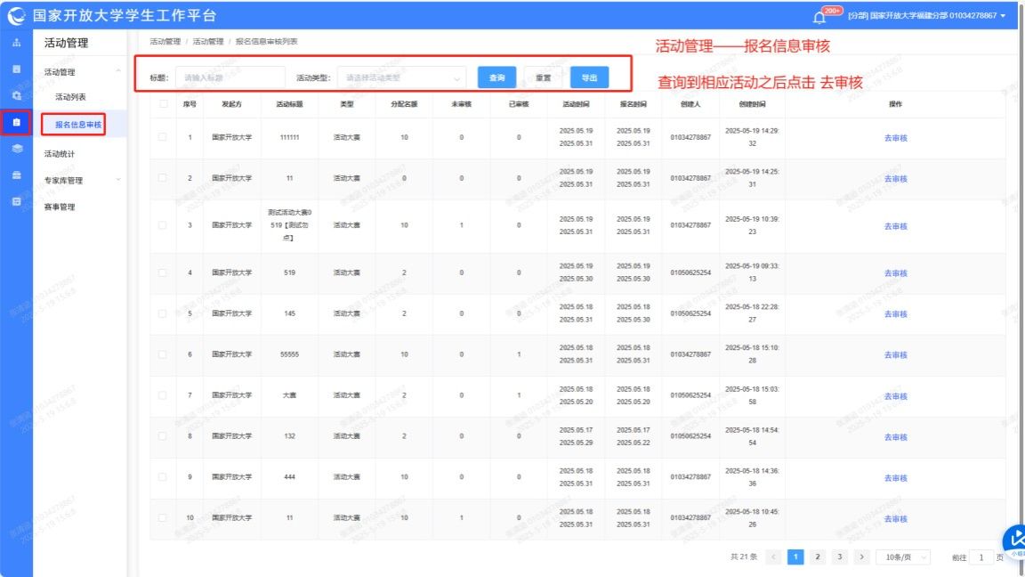 1.活动管理——报名信息审核——查询活动——点击“去审核”。