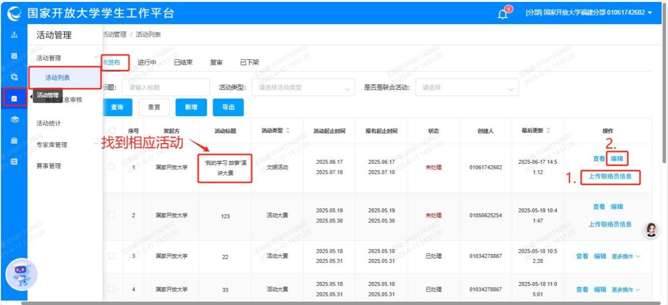 1.活动管理——活动列表,选择“未发布”一栏,找到相应活动。