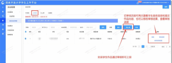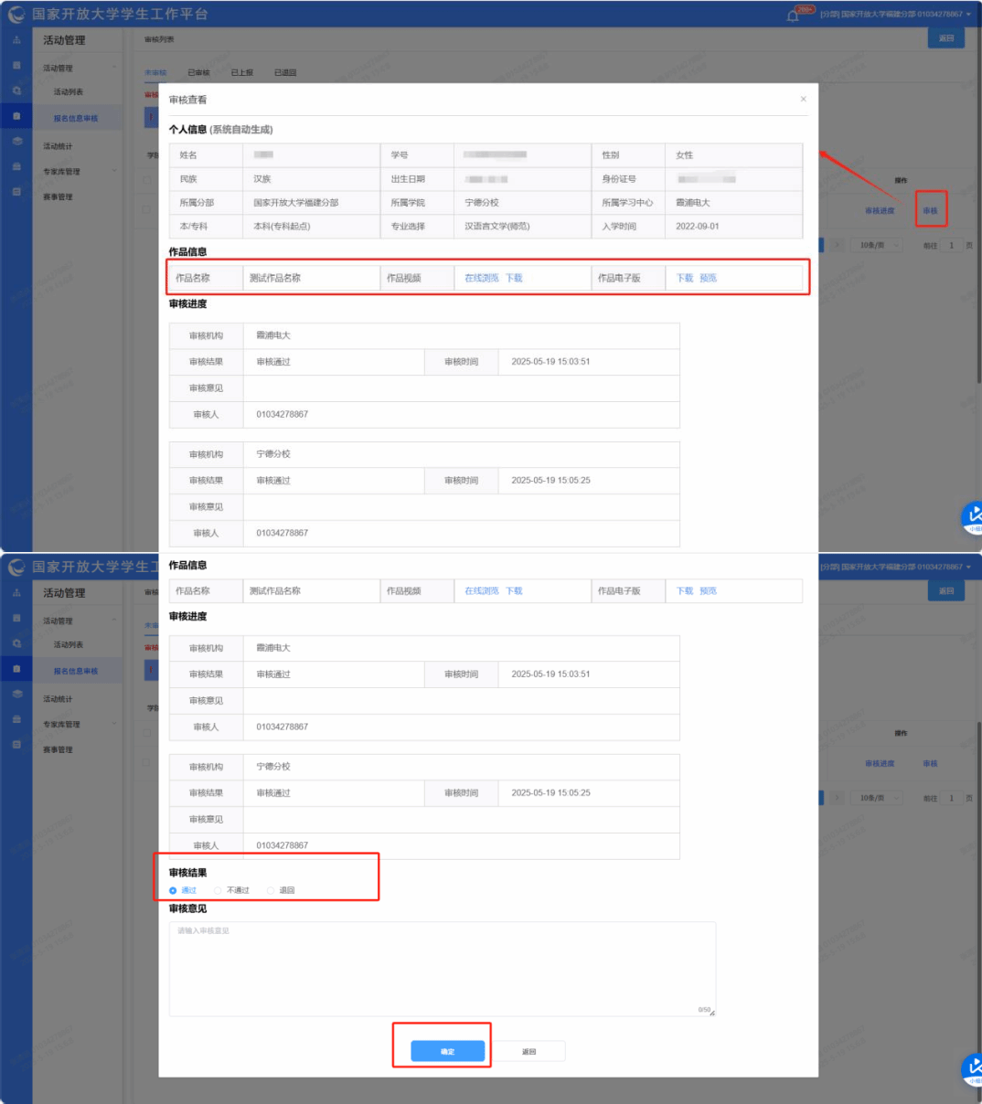 3.弹出学生参赛信息——查看作品——选择审核结果—— 输入审核意见——点击确认。