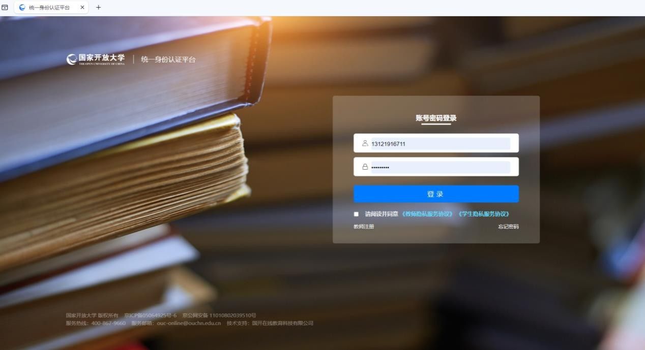 打 开 浏 览 器 , 在 地 址 栏 中 输 入 系 统 地 址 : https://menhu.pt.ouchn.cn/site/ouchnPc/index 登录国家开放大学统一身份认证平台。(注:首次登录平台后须进行账号注册,点击左下角“教师注册”按钮)