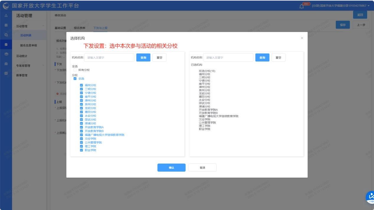 5.选定活动下发机构,点击确认。