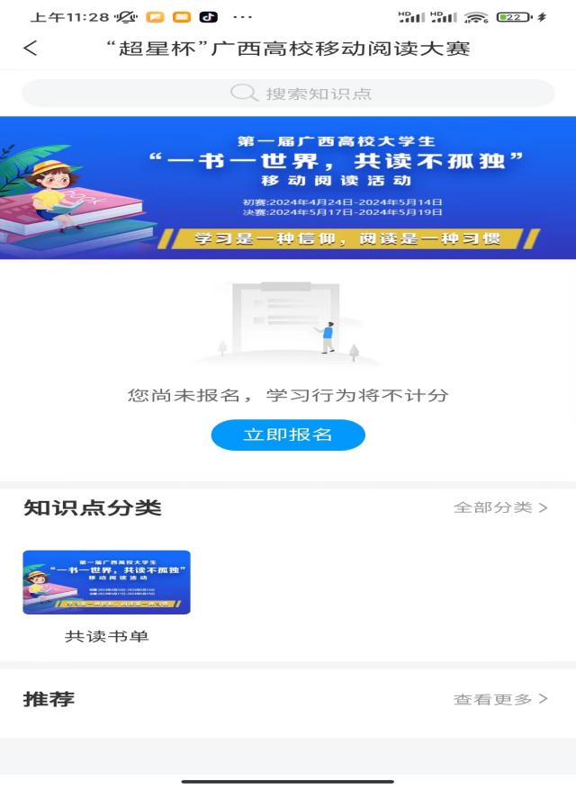 4.大赛首页点击“‘超星杯’移动阅读大赛”图标进入活动界面,点击“立即报名”即可参与活动。