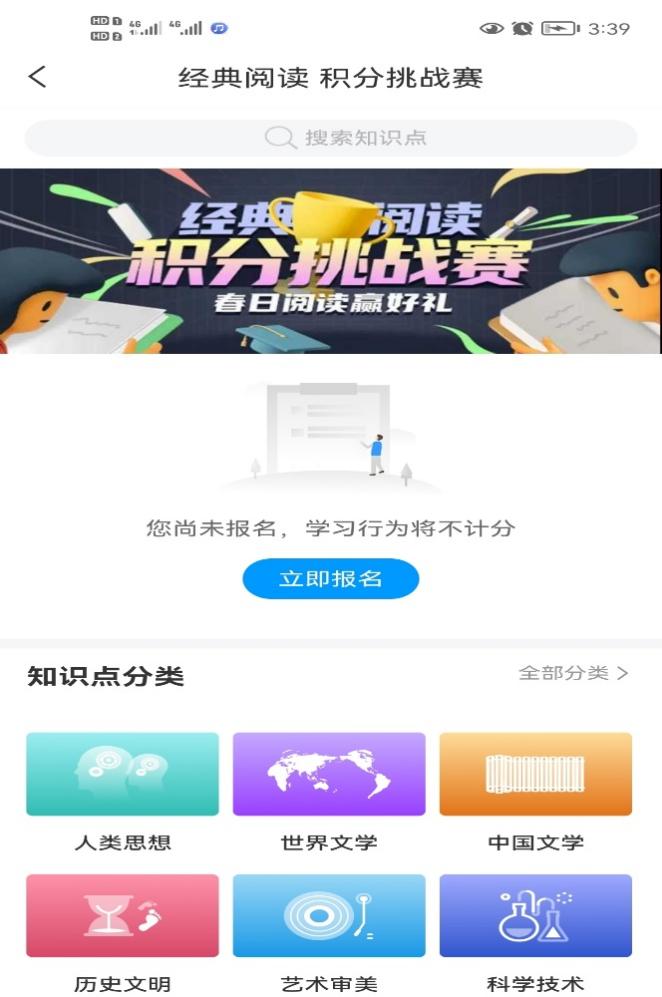 3.首页点击“经典阅读积分挑战赛”模块进入活动界面,点击“立即报名”即可参与活动。