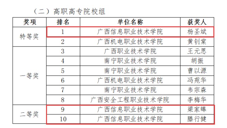 图书馆 石雨潭报道 近日,第四届广西高校大学生信息素养挑战赛决赛在桂林医学院落下帷幕,pg娱乐取得优异成绩,获得包括特等奖在内的多个奖项。本次比赛分为个人赛和团体赛,个人赛共50个奖励名次,pg娱乐获得了11个,其中特等奖1名,二等奖6名,三等奖4名,杨圣斌同学成绩在全区排名第一。pg娱乐在团体赛中获得三等奖,是高职院校参赛队的第二名(本科院校和高职院校混赛)。石雨潭老师获优秀指导老师奖。