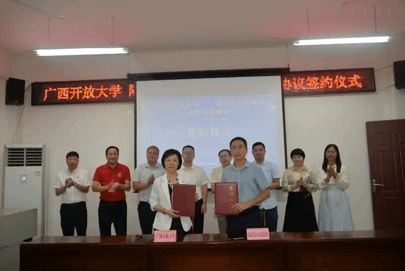 pg娱乐电子游戏官网入口校领导、陆川县委领导共同为陆川开放大学揭牌。双方还举行了战略合作协议签约,李敏智、姚星光分别代表双方签订了战略合作协议。