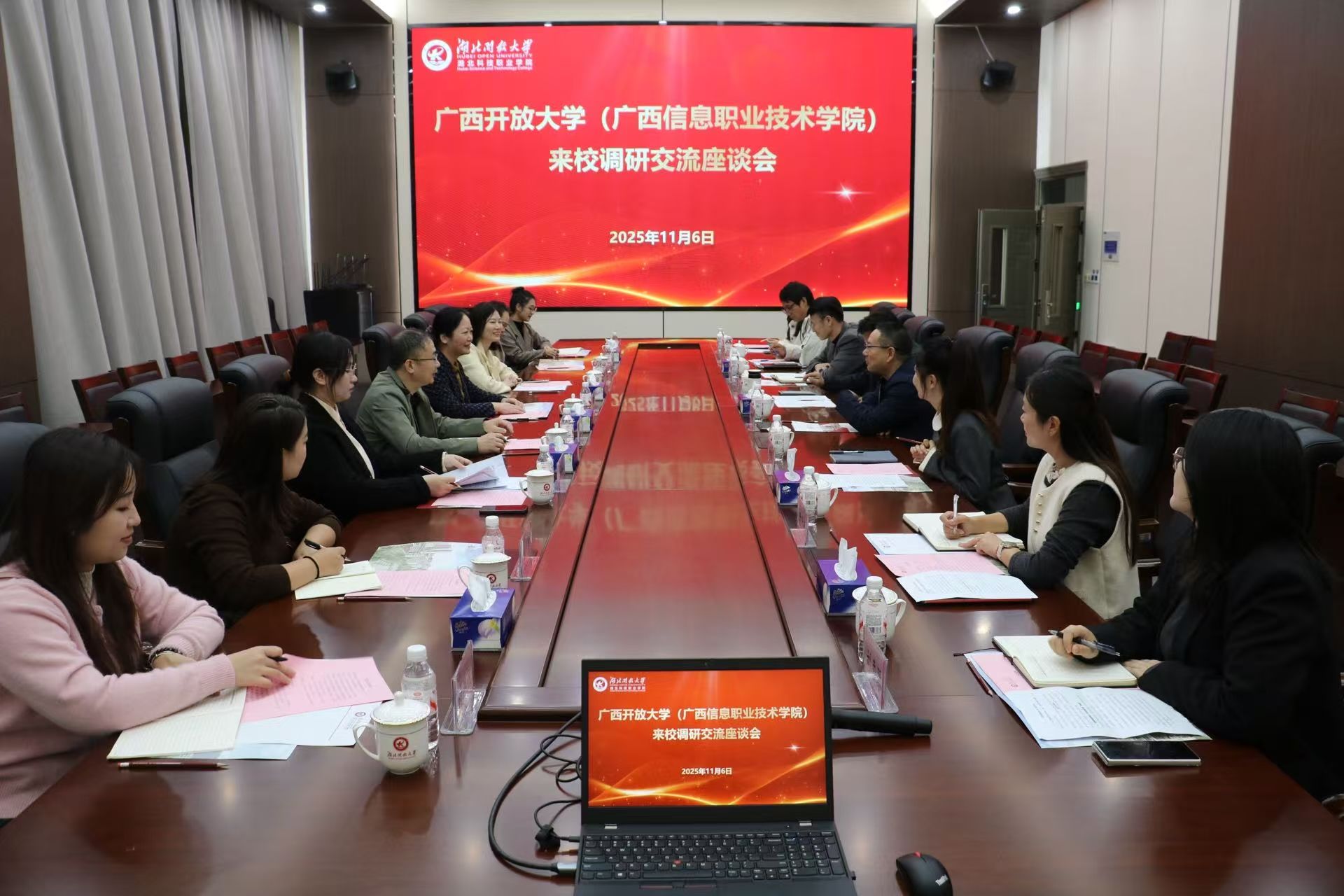 ▲调研组与湖北开放大学、湖北科技职业学院座谈交流