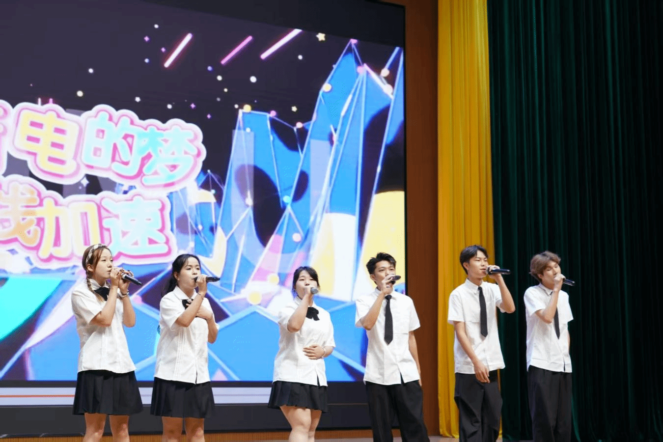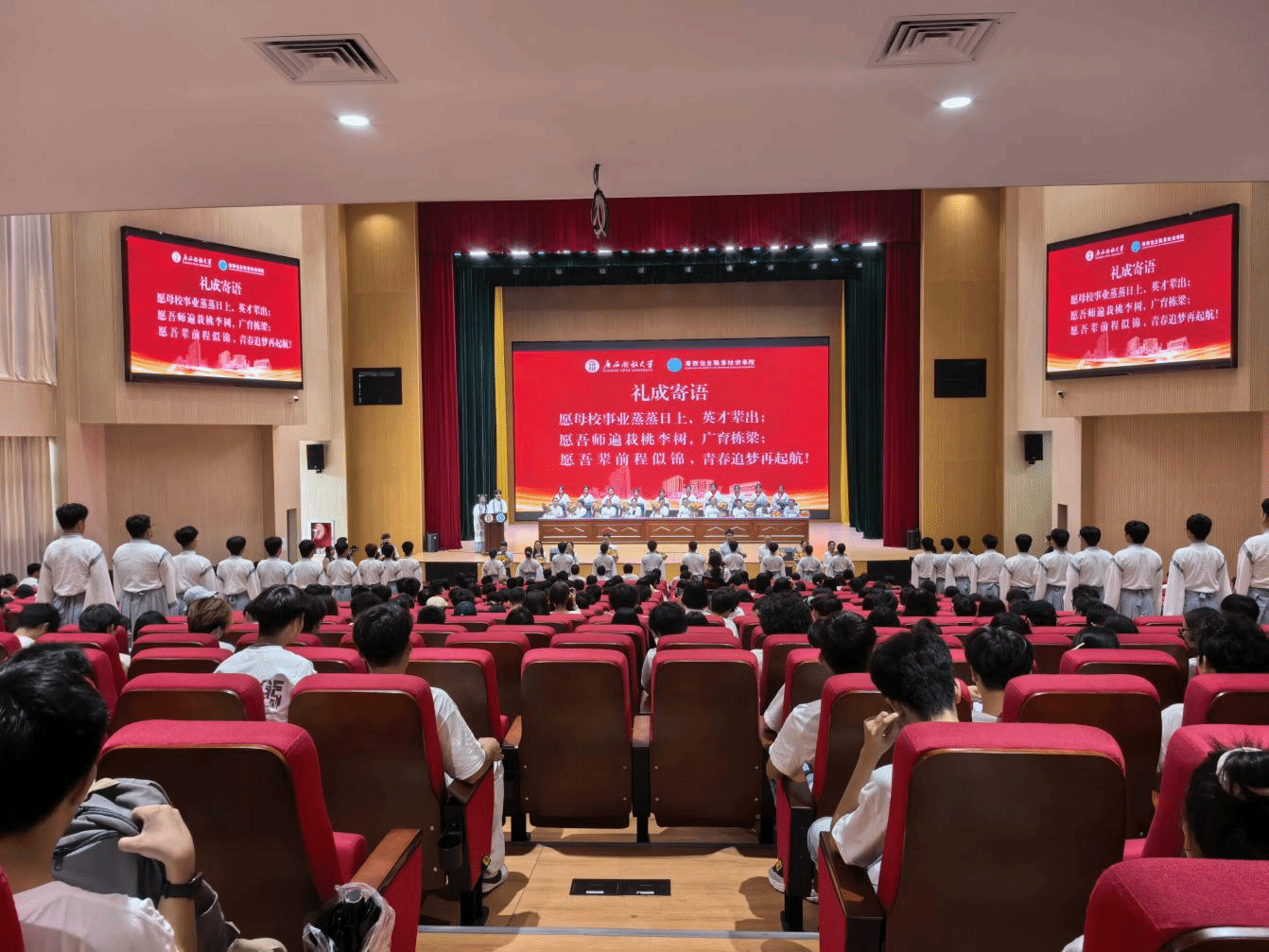 典礼前,学生们用美妙的歌曲致敬青春,点燃毕业梦。