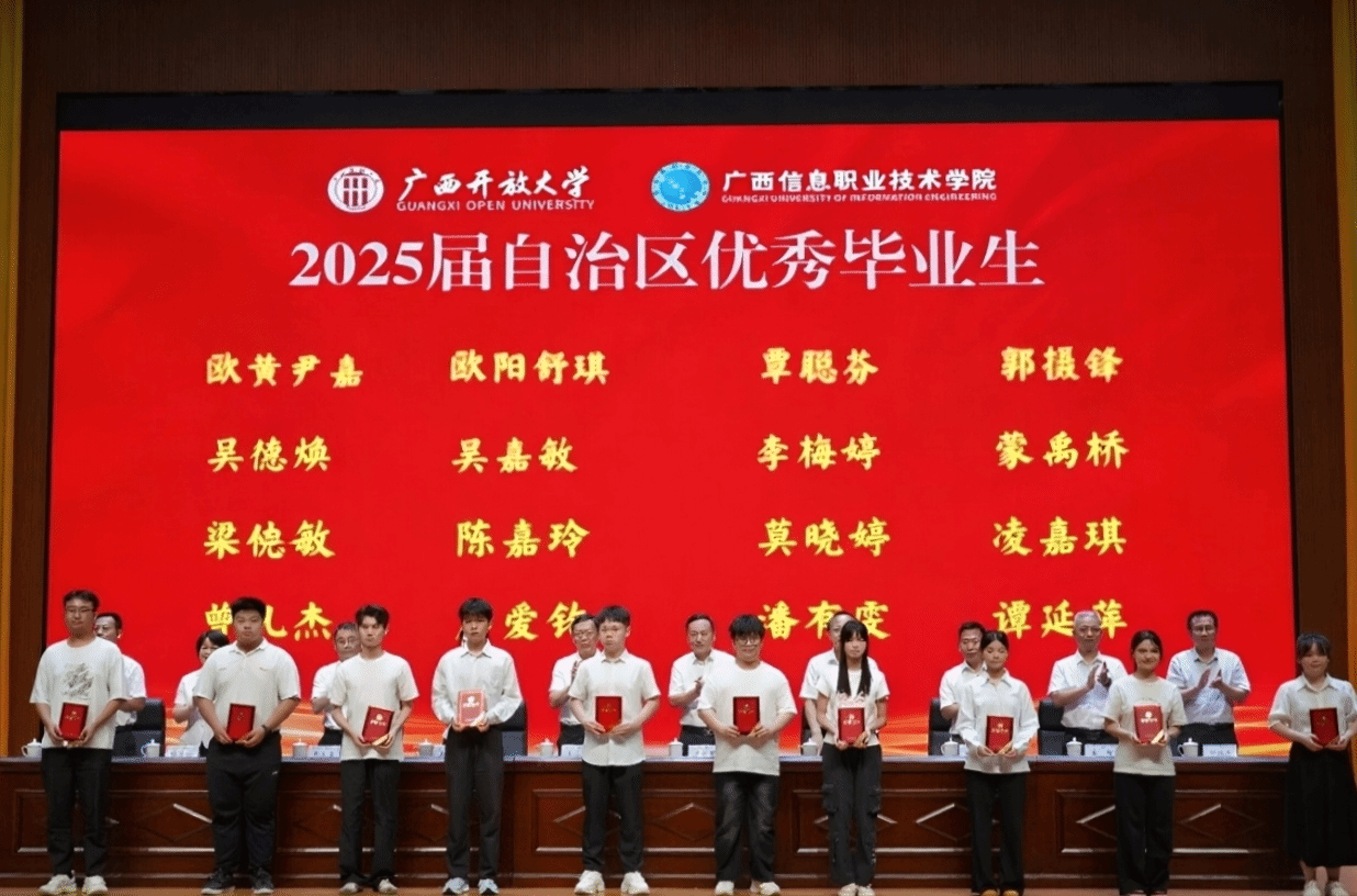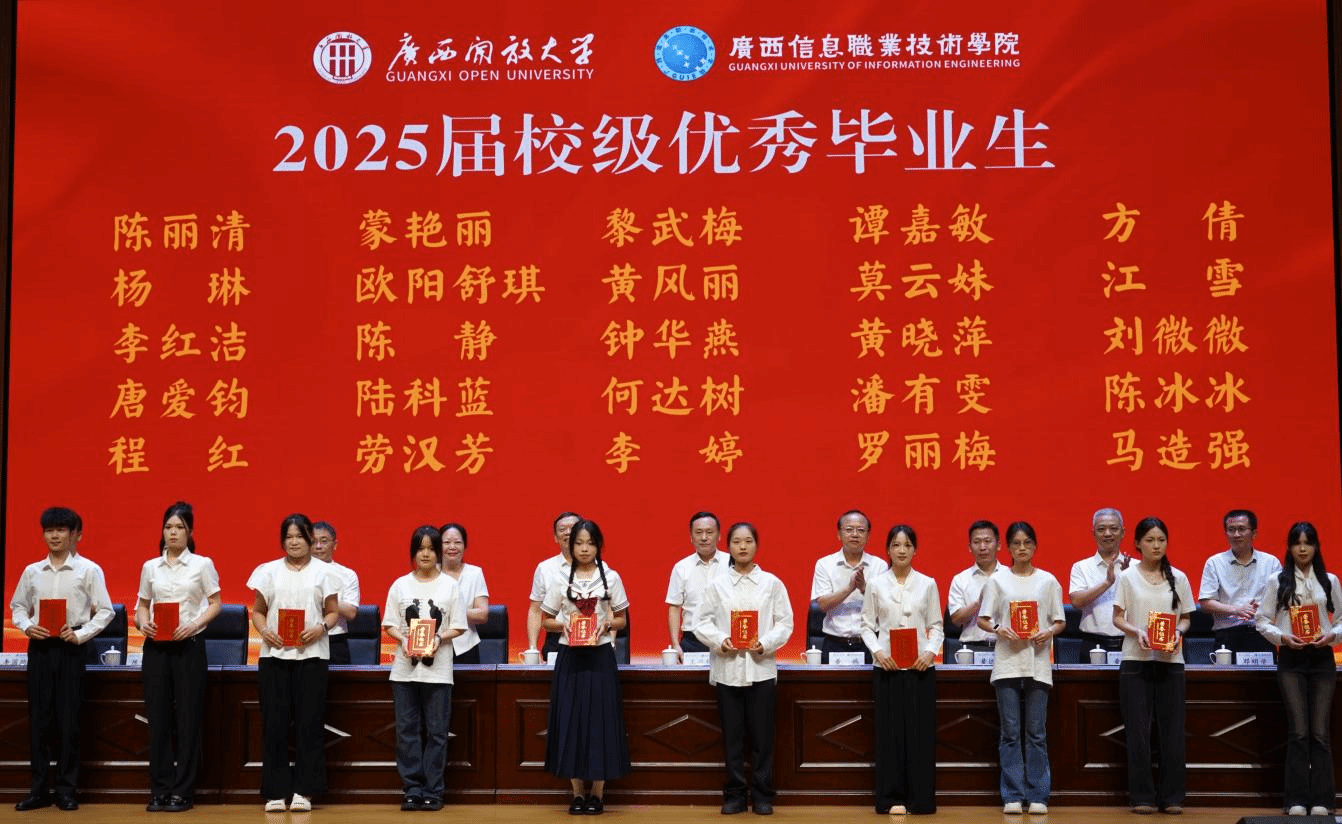 求学的过程是师生双向奔赴的接力,每一份闪耀的成绩背后,都凝聚着师生的智慧与汗水。龙雪津宣读《自治区教育厅关于认定2025届广西壮族自治区普通高等教育优秀毕业生的通知》《pg娱乐电子游戏官网入口关于表彰2025届校级优秀毕业生的决定》,学校覃聪芬等27名同学获得2025届“自治区优秀毕业生”荣誉称号、卢梦莹等181名同学获得学校“2025届优秀毕业生”荣誉称号。