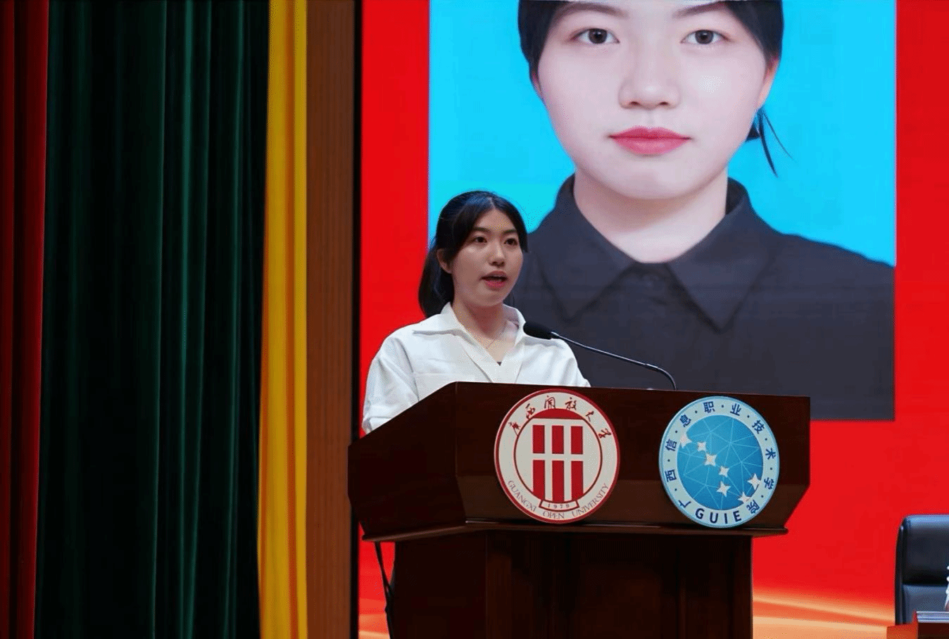 优秀毕业生代表、数字经济与管理学院2022级网络营销与直播电商6班欧阳舒琪分享了自己的成长感悟与未来展望,展现出广信学子积极向上的精神风貌。