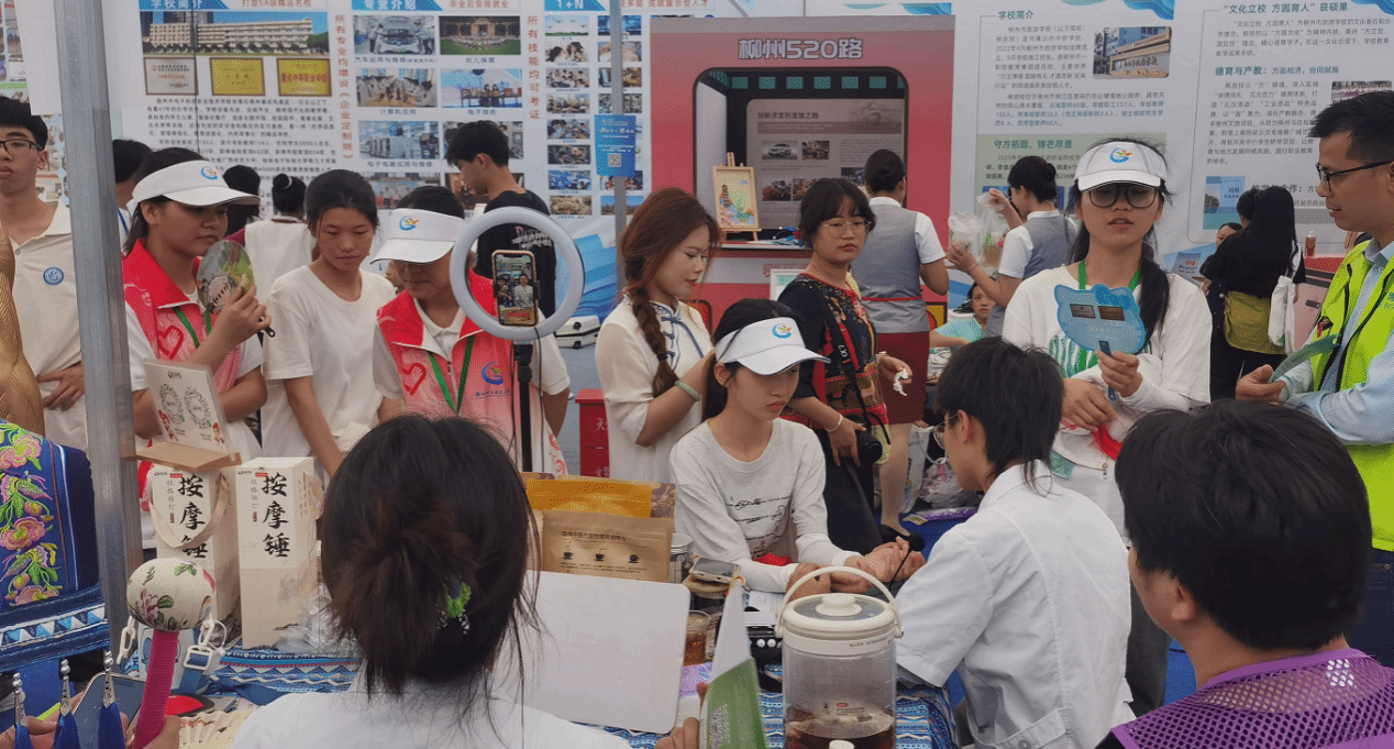 在职业教育成果展示环节,学校以“北斗智脑·技领未来”“康养云链·惠泽民生”“数媒艺境·多维视界”为主题,通过展板、实物、模型、交互活动、视频、数字资源等形式充分展示学校职业教育教学成果和办学特色。学校选取了北斗高精定位技术模型、嵌入式芯片智慧灯杆、星闪野生动物监测系统、国产芯片教学设备、艾灸推拿展示、壮药香囊等康养产品、跨境健康云平台、绘画《舞狮》等作为亮点作品,同时推出“中医康养赋能,共筑健康未来”和“AI空间设计体验”现场活动,吸引了众多领导嘉宾、媒体记者、兄弟院校、企业、现场观众等驻足观看、采访、咨询、体验。
